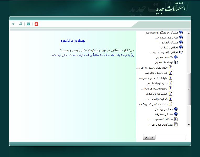 بسم الله الرحمن الرحیم متن استفتاء به شرح ذیل است: سوال: نظر جنابعالى در مورد چت کردن دختر و پسر چیست؟جواب: با توجه به مفاسدى که غالباً بر آن مترتب است، جایز نیست. ![]() اصول کافی، باب اصرار بر گناه، ح
